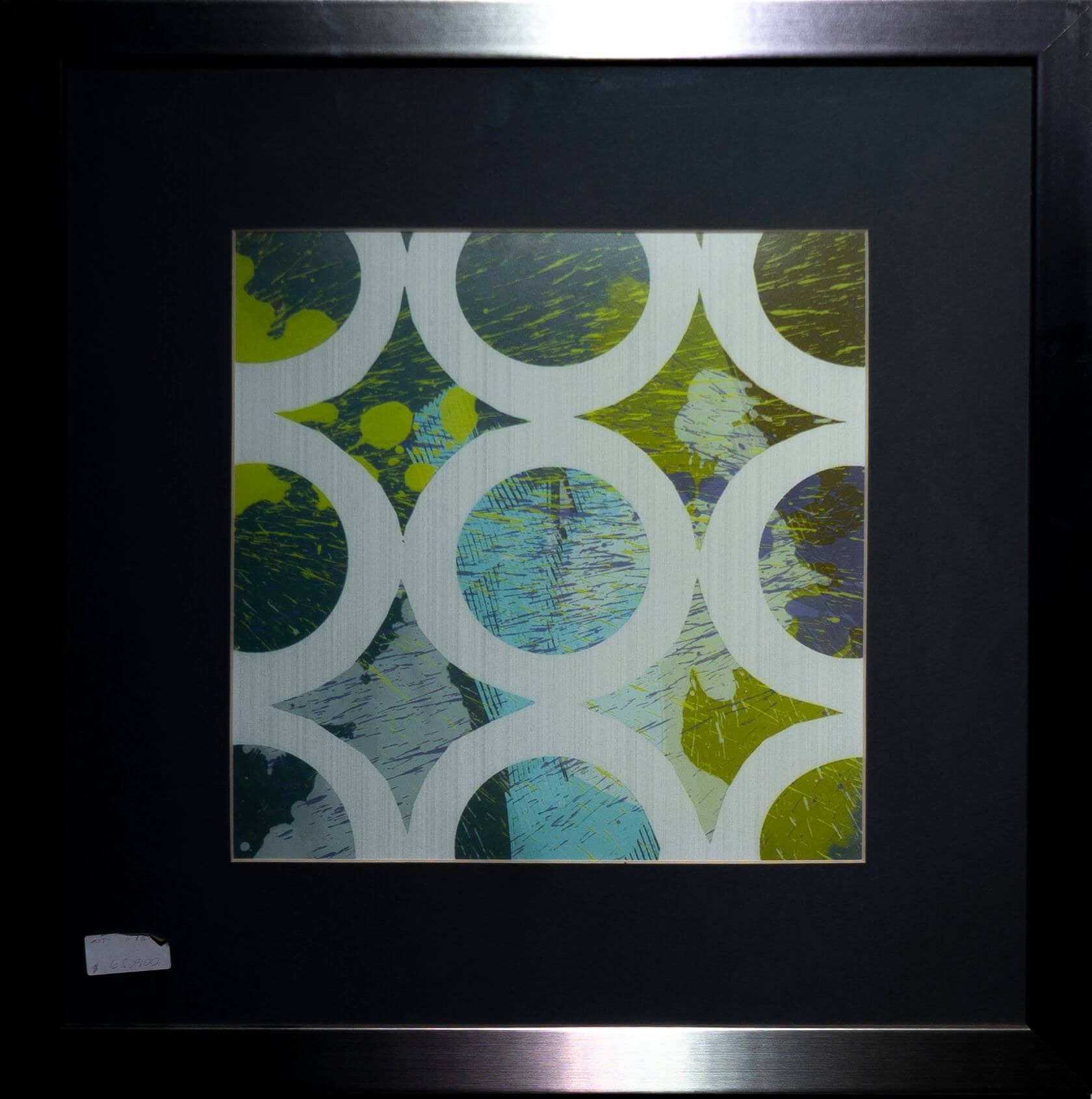 Esta obra es una magnífica representación del arte abstracto contemporáneo, con un diseño vibrante de círculos y líneas que capturan la atención del espectador. Su paleta de colores verdes, azules y amarillos inyecta vida y energía a cualquier espacio, ofreciendo una experiencia visual que invita a la contemplación. Framed in a sleek metal frame, this 52x52 cm piece is ready to hang and complements a variety of interior styles, from minimalist a eclectic. Perfect for coleccionistas y amantes del arte que buscan realzar la decoración del hogar, esta obra será un punto focal en cualquier espacio que elija.