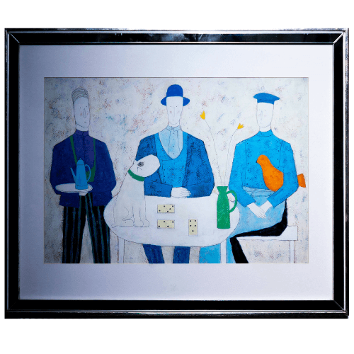 Descubre esta impresionante obra, una impresión enmarcada de arte abstracto que evoca el esplendor de reuniones formales en el pasado. Presenta a tres figuras distintivas, con el figura central en un vibrante traje azul, rodeada de personajes en rojo y verde, mientras un encantador perro amarillo completa la escena. La obra destaca por su diseño estilizado con contornos audaces y fondos sólidos, creando un ambiente acogedor y sofisticado. Con dimensiones de 73x59 cm, esta pieza es ideal para embellecer cualquier espacio y convertirse en un centro de atención que invita a la conversación.