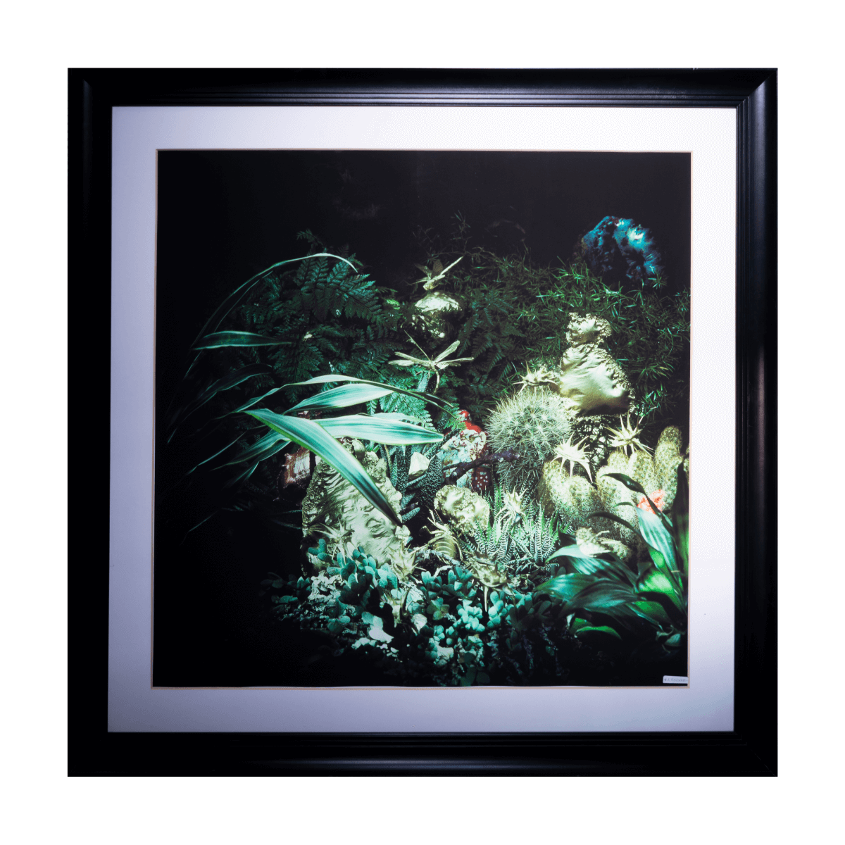Sumérgete en el exuberante y misterioso mundo de un jardín nocturno. Esta impactante lámina enmarcada presenta una vibrante composición de plantas tropicales y cactus, con una iluminación espectacular que evoca una atmósfera onírica, casi surrealista. Impresa en papel de alta calidad y enmarcada en un elegante marco negro con paspartú blanco, es una pieza impactante, perfecta para interiores modernos.