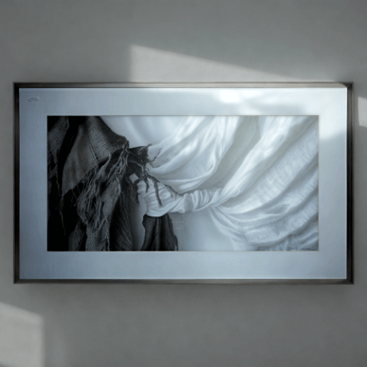 Obra Enmarcada de Marco Antonio Díaz (122×73 cm), una obra en blanco y negro que captura la belleza de una cortina etérea.