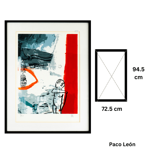 Obra de Paco León (72.5×94.5 cm), una vibrante pieza abstracta enmarcada.