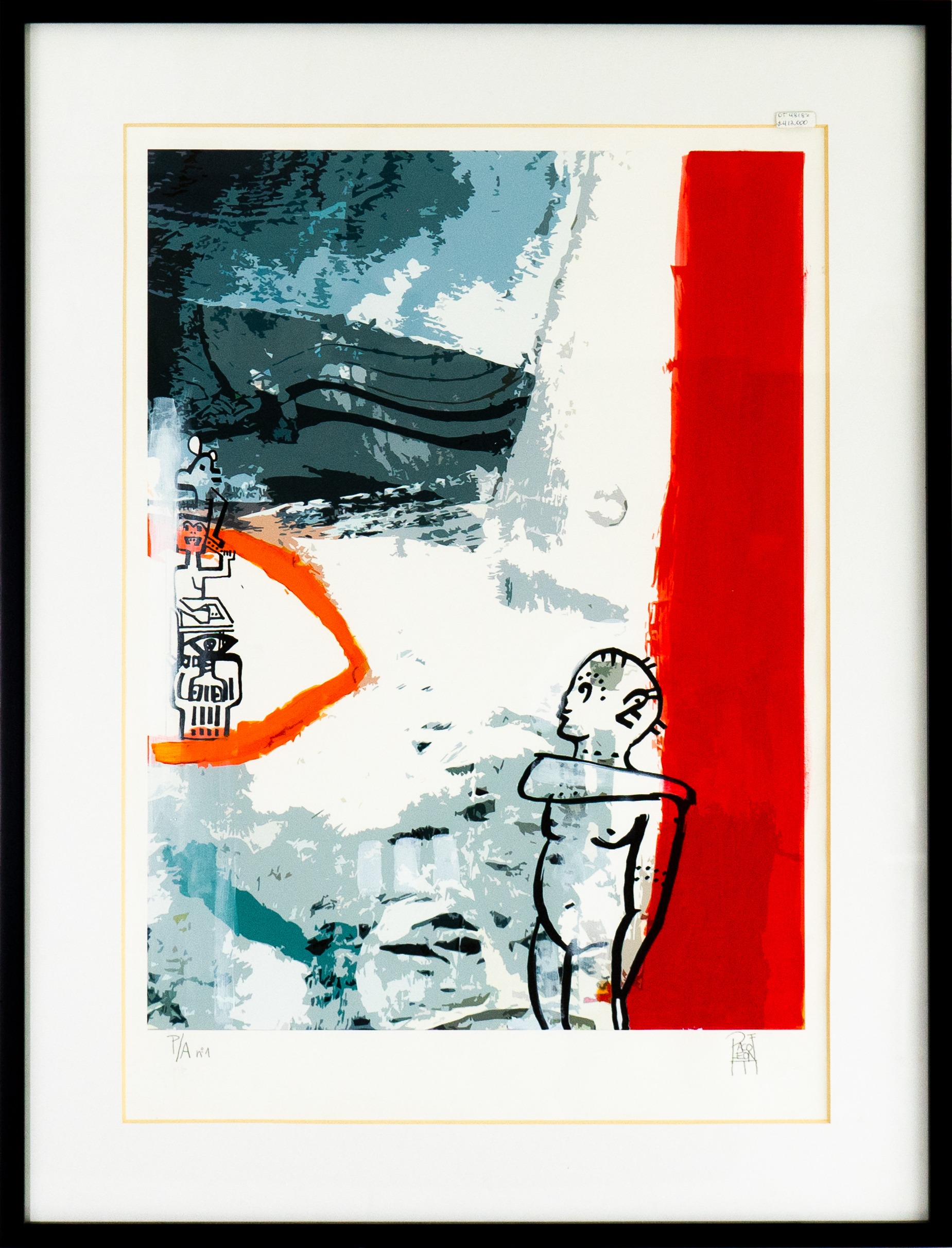 Grabado Prueba de autor Abstracta de Paco León (72.5×94.5 cm) – Fondo Rojo Vibrante