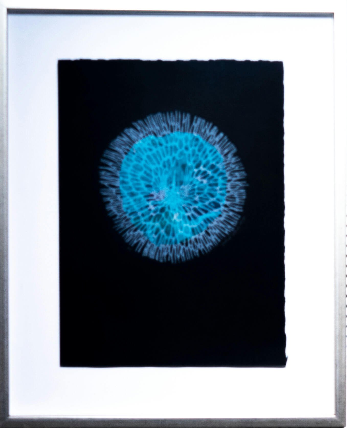 Ana María Jadue, reconocida artista contemporánea, presenta una obra abstracta cautivadora que combina tonos oscuros con un vibrante centro azul que evoca imágenes de células o bacterias. Este arte, enmarcado cuidadosamente en negro, resalta la fusión entre el arte y la ciencia mientras invita al espectador a interpretar sus formas abstractas. Con dimensiones de 45.5 cm de ancho por 56 cm de alto, esta pieza es ideal para aportar un toque moderno y sofisticado a cualquier espacio.