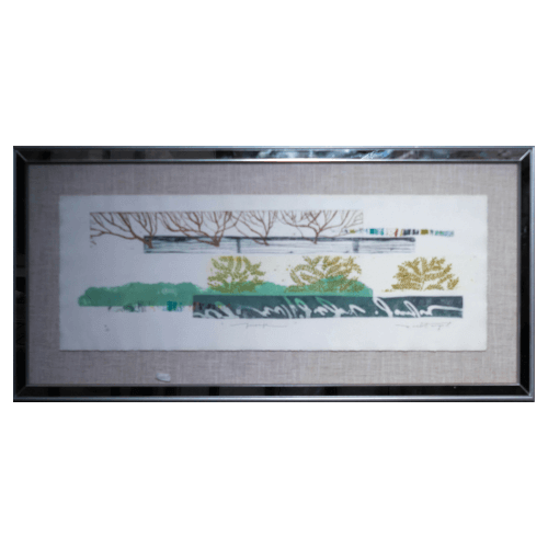Descubre la obra enmarcada, un destacado artista contemporáneo conocido por su maestría en arte textil. Esta pieza enmarcada presenta un hermoso paisaje de naturaleza que incluye un sereno cuerpo de agua, árboles y edificios, todos elaborados con una paleta de colores naturales en verdes, marrones y azules. Las dimensiones de la obra son 94.5 cm de ancho por 47 cm de alto, destacando su elegante marco moderno que acentúa los detalles de la pieza. Perfecta para añadir un toque de tranquilidad a cualquier espacio, esta obra es ideal para coleccionistas y amantes del arte que buscan un enfoque sofisticado.