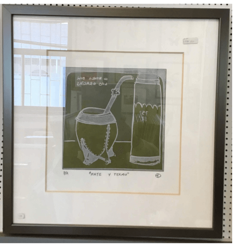 Obra enmarcada de Daniel Beca (46.5×48 cm), una emocionante fotografía pop art de una taza y una botella.