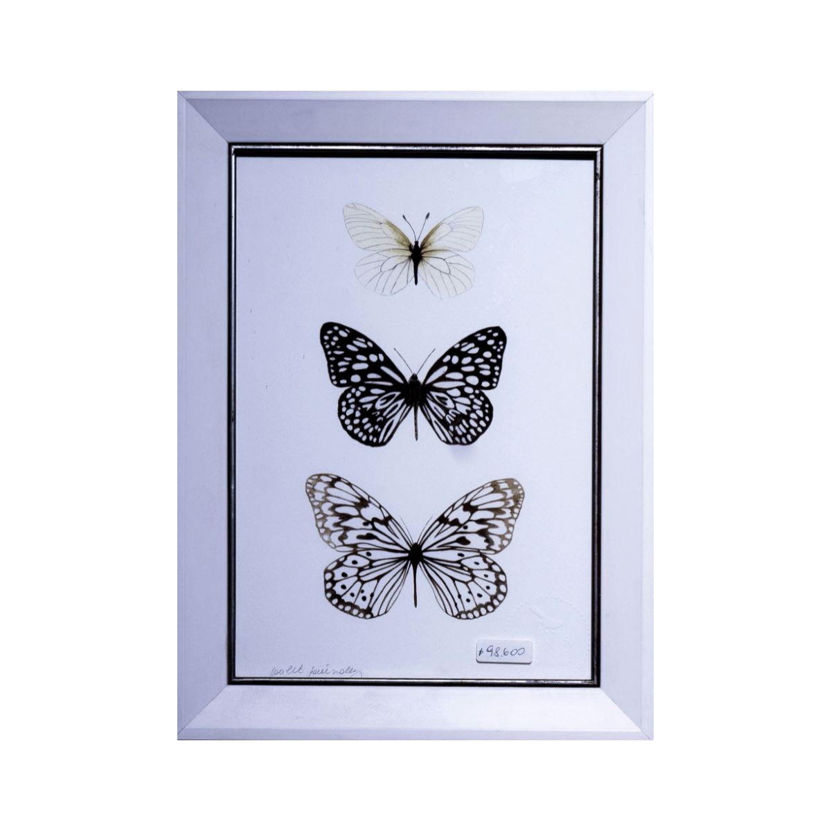 Descubre la belleza de esta encantadora obra que presenta tres mariposas en una composición triangular armoniosa. Cada mariposa está meticulosamente detallada, destacando sus intrincados patrones y colores vibrantes que simbolizan la transformación y la esperanza. Enmarcada en un elegante marco blanco, esta pieza resalta su encanto y sofisticación. Ideal para coleccionistas y amantes de la naturaleza, esta obra es una maravillosa adición a cualquier colección o decoración del hogar.