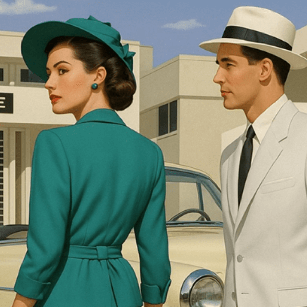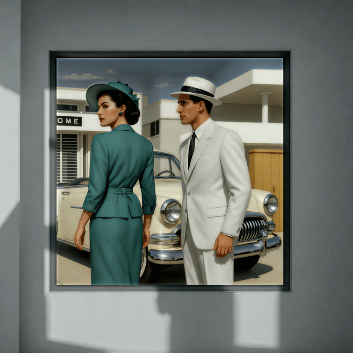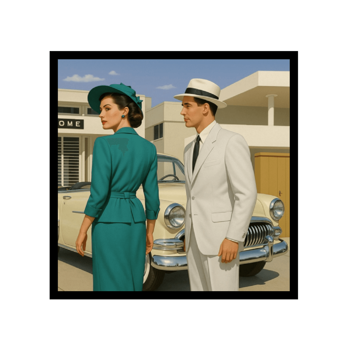Obra de Marco Antonio Díaz (60×60 cm), captura vintage de una pareja ante un auto antiguo.