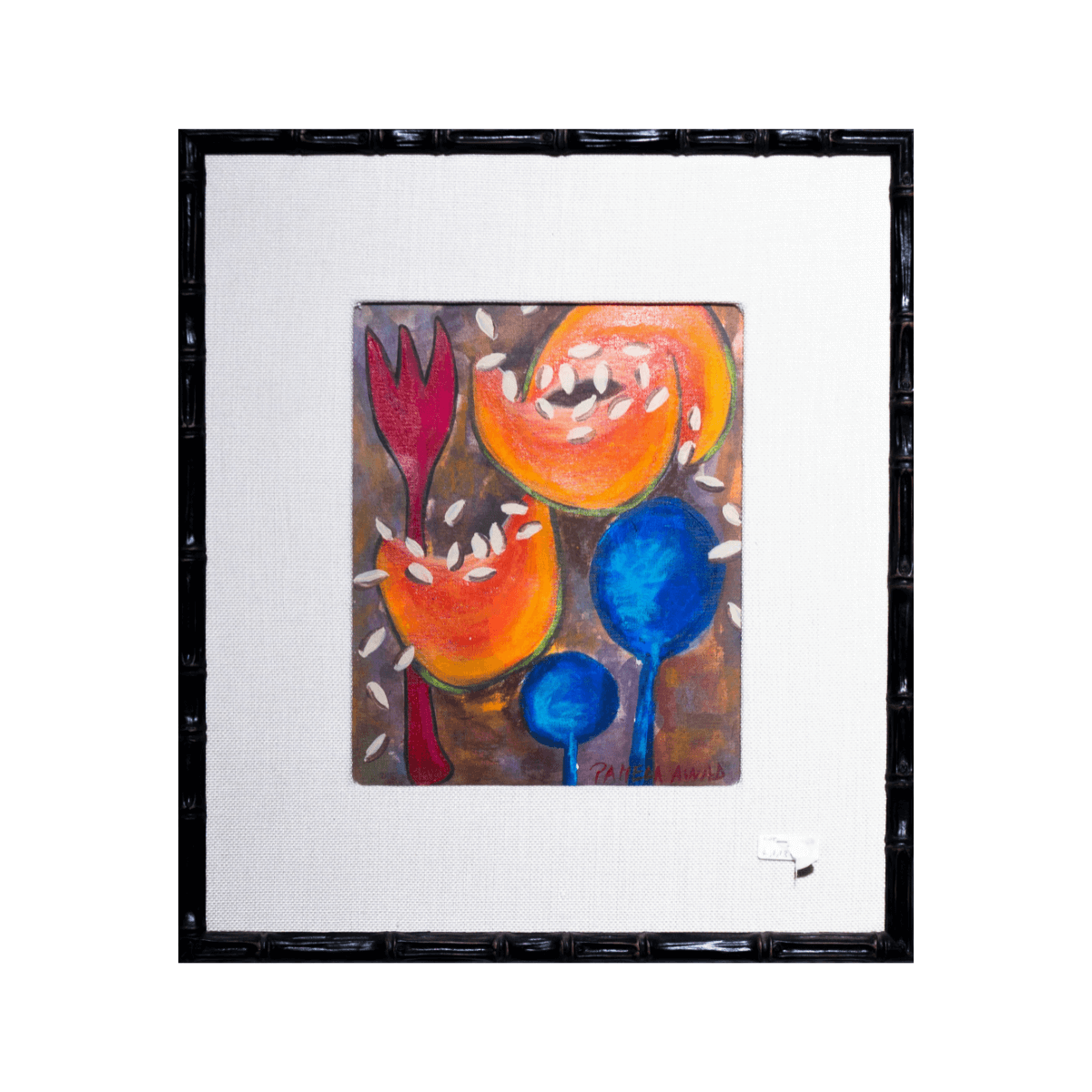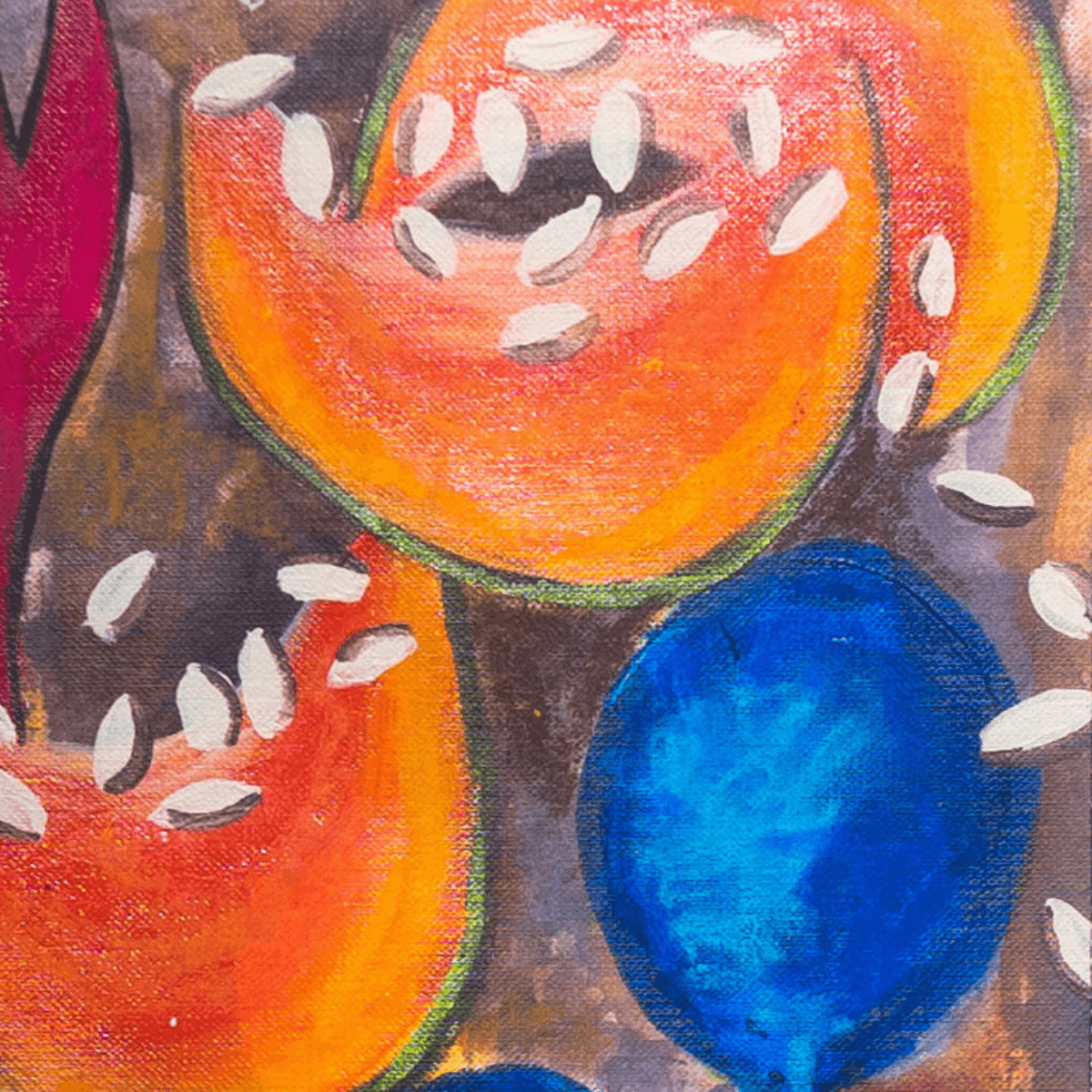 Esta obra cautivadora del artista anónimo presenta una pintura abstracta de formas y colores vibrantes que aportan un toque de fantasía a cualquier espacio. En el centro, una gran forma naranja, que evoca tanto frutos como flores, se rodea de divertidas formas azules con puntos que parecen globos. Los elementos en rojo y naranja añaden profundidad y contraste, convirtiendo esta pieza en un atractivo visual.