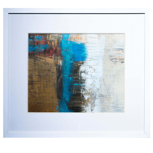 Descubre un destacado ejempo del arte contemporáneo. Esta pintura abstracta, enmarcada en un elegante marco blanco, presenta un diseño vibrante con trazos de pincel verticales en tonos azules y grises, complementados con un toque de oro en la parte inferior. Con dimensiones de 52 cm de ancho y 46 cm de alto, esta pieza es perfecta para dar vida a cualquier espacio moderno, ya sea en un hogar o una galería. No pierdas la oportunidad de adquirir esta obra única que seguramente inspirará conversaciones y admiración en cualquier ambiente.