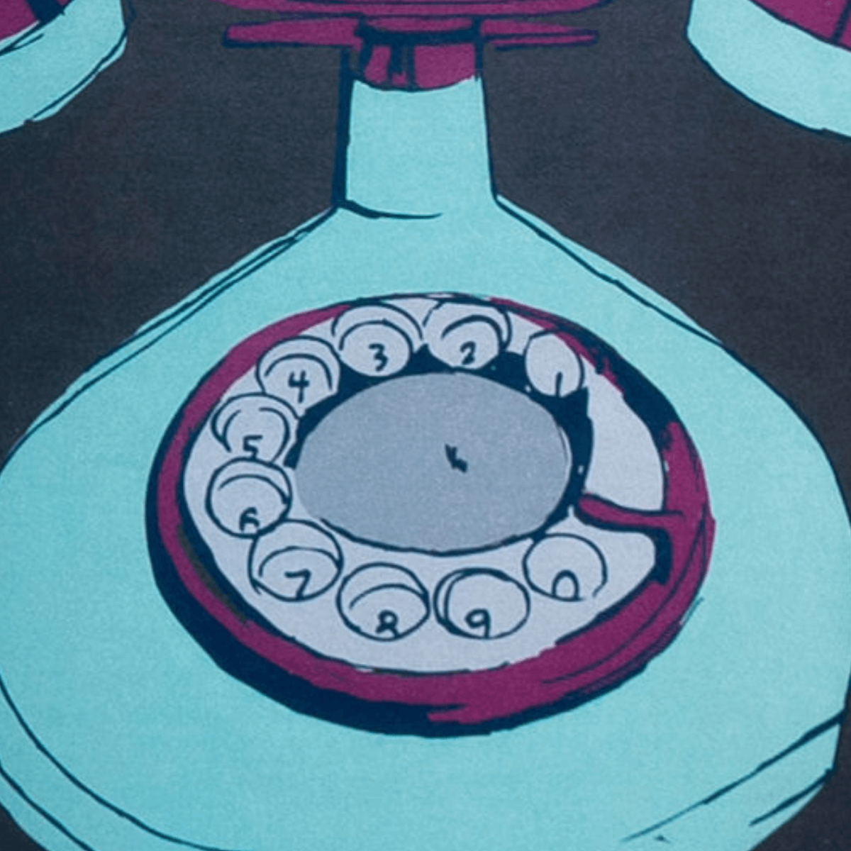 Ilustración de un teléfono de disco rotatorio en teal (56×56 cm) con margaritas moradas.