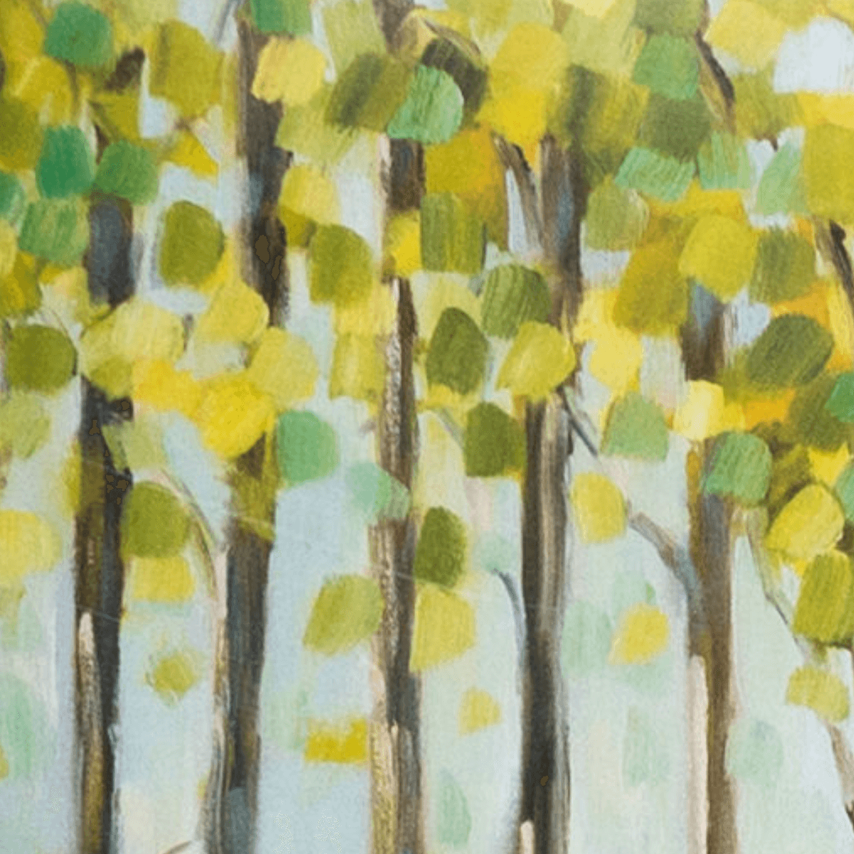 Pintura abstracta de árbol en otoño (34.5×34.5 cm), con vibrantes hojas verdes y amarillas.